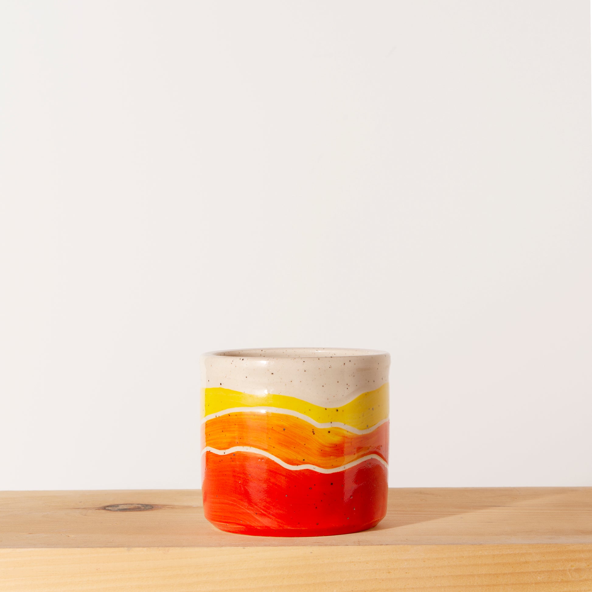 Made with a speckled stoneware clay, decorated with bright underglazes and coated with a glossy clear glaze. Fired to cone 6. Dishwasher and microwave safe.