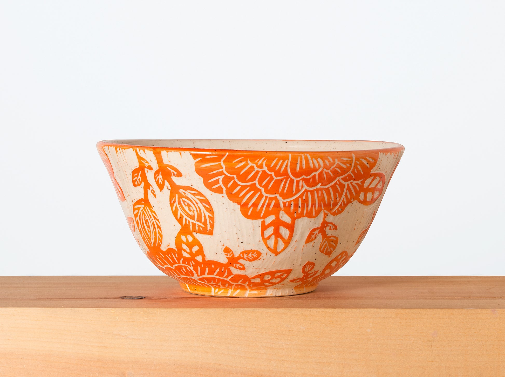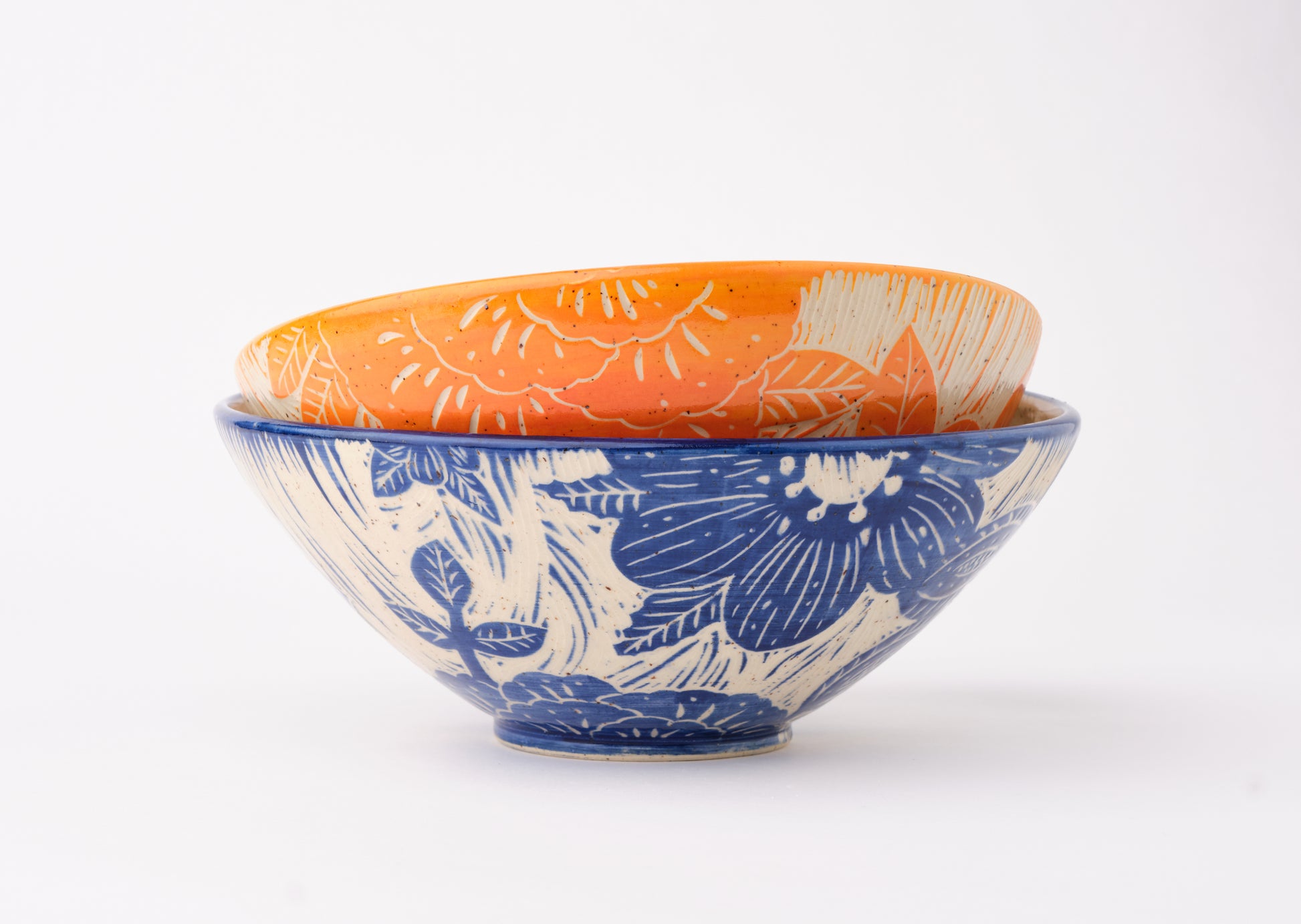 Salad? roasted veggies? Noodles? Or maybe rice? Anything looks perfect when it is presented in this lovely bowl with bright orange and yellow flowers carved into the surface. It is 100% functional as it is made from speckled stoneware clay and fired to a hard cone 6. It is both dishwasher and microwave safe.